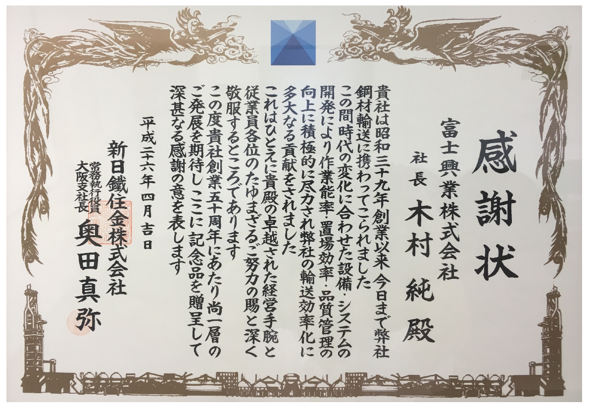 弊社創業50周年にあたり新日鐵住金株式会社大阪支社長奥田真弥様より感謝状を頂きました