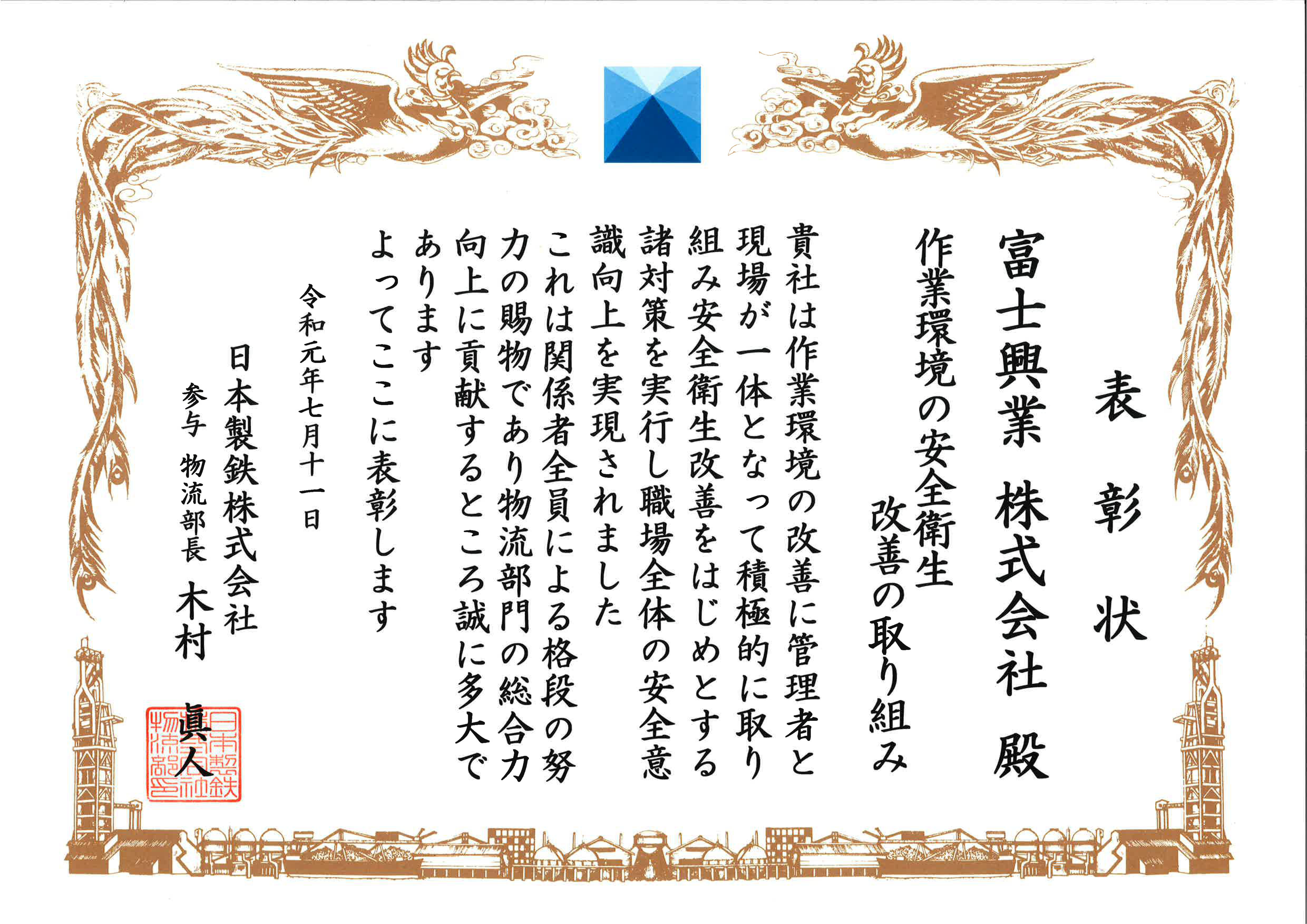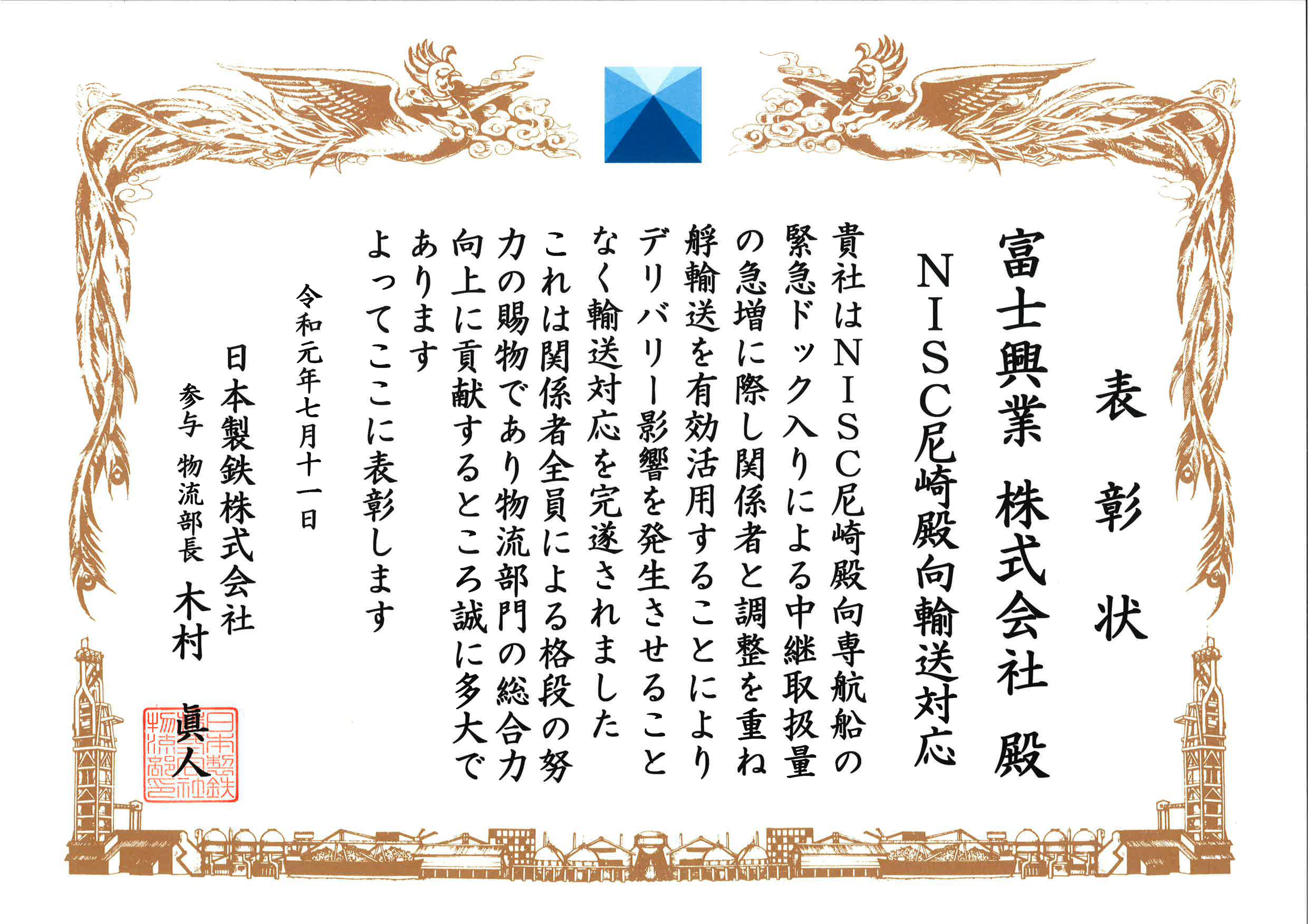 日本製鉄株式会社様より物流部長表彰を頂きました