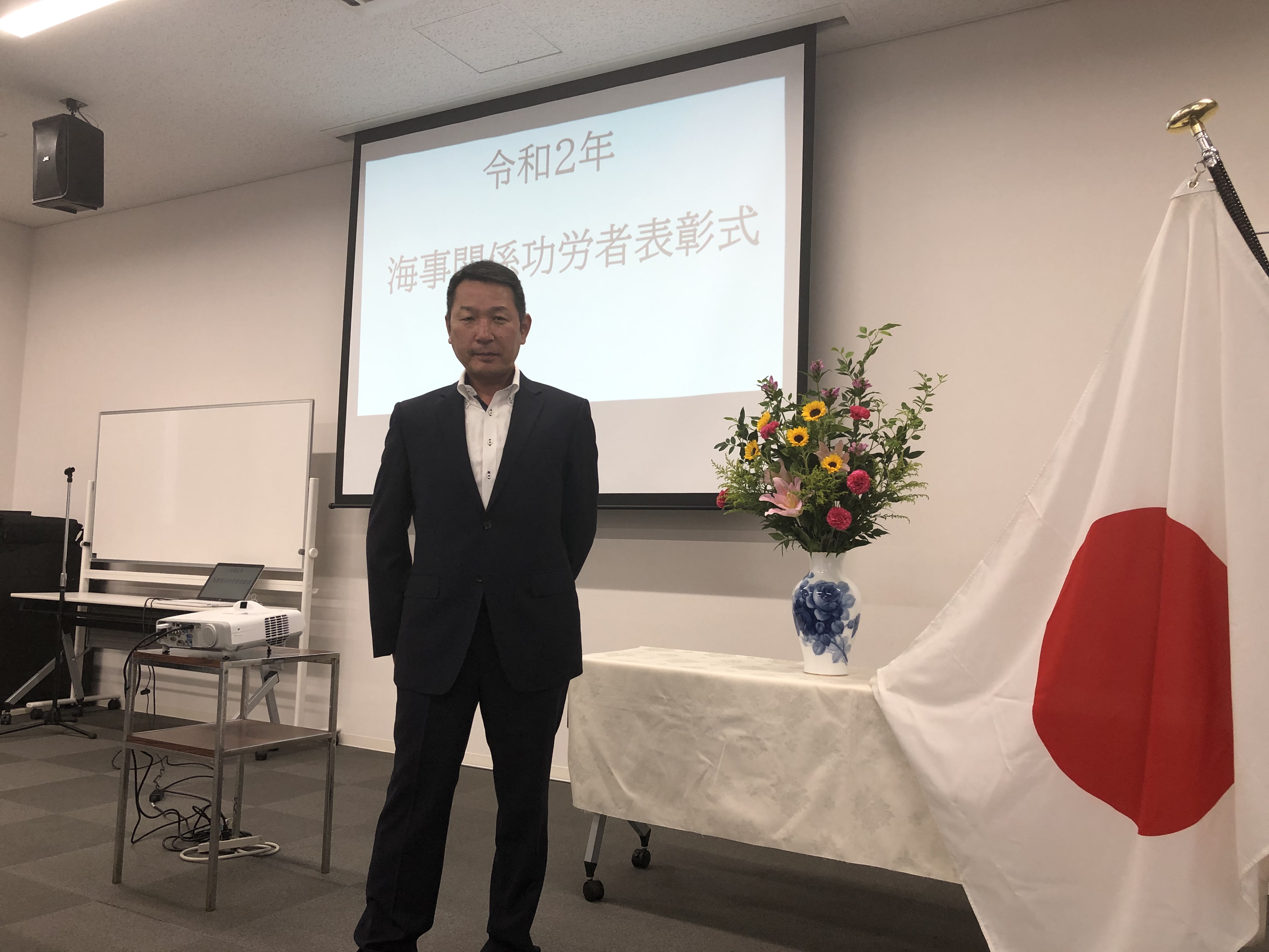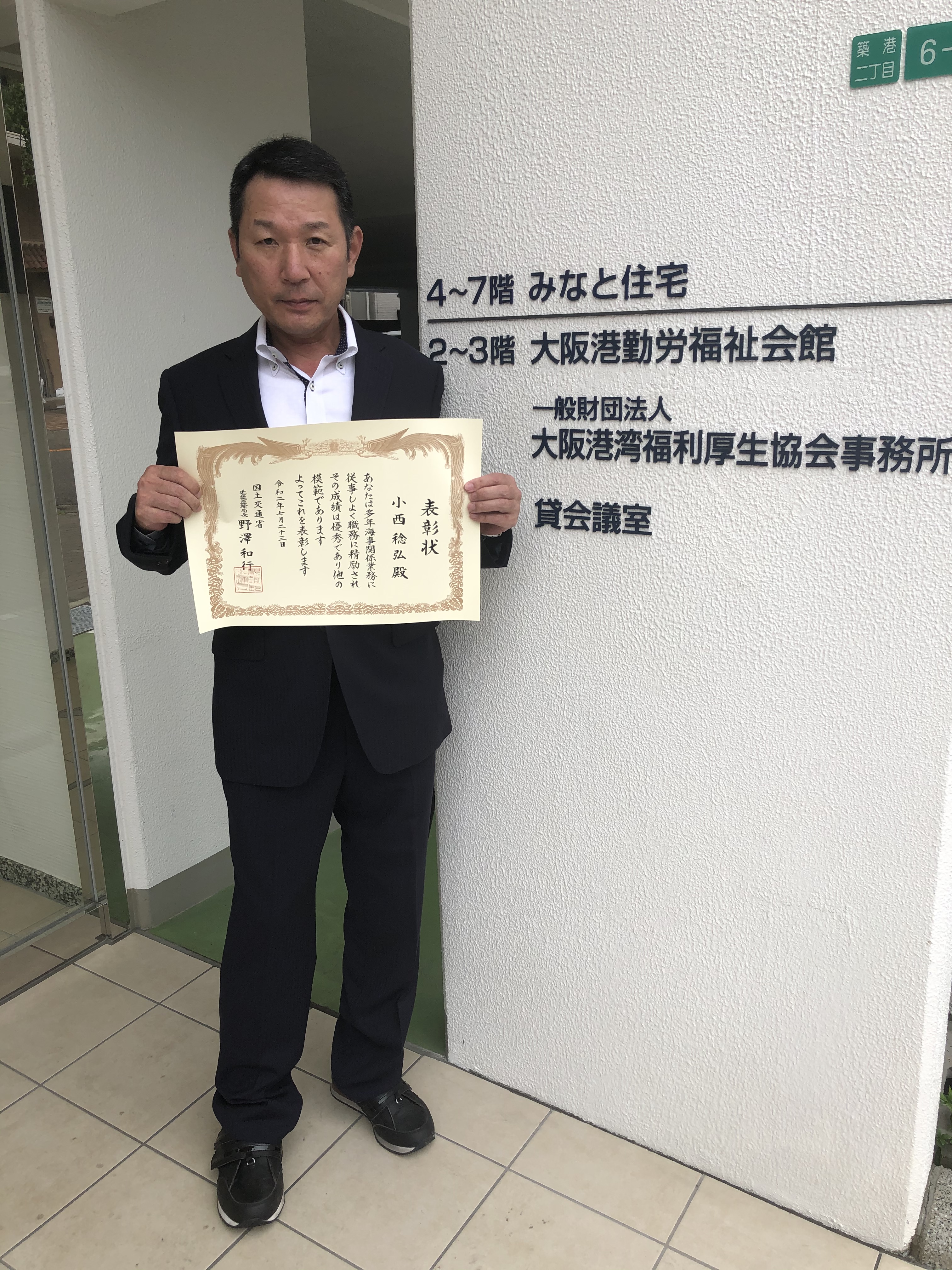 海事関係功労者表彰 令和2年7月28日「海の日」 長年の実績が国土交通省に認められ 当社業務部輸送課長の小西稔弘が 近畿運輸局長表彰を受彰いたしました。 例年は式典や祝賀会が開催されていましたが 本年は新型コロナウイルス感染症による現状を鑑み 規模を縮小した表彰式が受彰者みの列席で開催されました。 国土交通省近畿運輸局長様より表彰状を頂きました。 小西課長おめでとうございます!今後、益々のご活躍を心よりお祈り申し上げます。