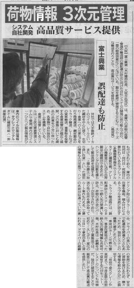 物流ニッポンに掲載されました 「物流ニッポン」8月3日号、8月6日号に当社の記事が掲載されました。 8月3日号では主に、当社の労働環境改善の取り組みについて掲載して頂きました。 ※物流ニッポン様から記事を掲載させて頂きました。 8月6日号では自社開発した3次元置場管理システム、誤配達防止システム(GBS) について掲載して頂きました。 ※物流ニッポン様から記事を掲載させて頂きました。 これに満足することなく、今後もさらに社内環境やサービス、品質向上に努めてまいります。 ご安全に!!