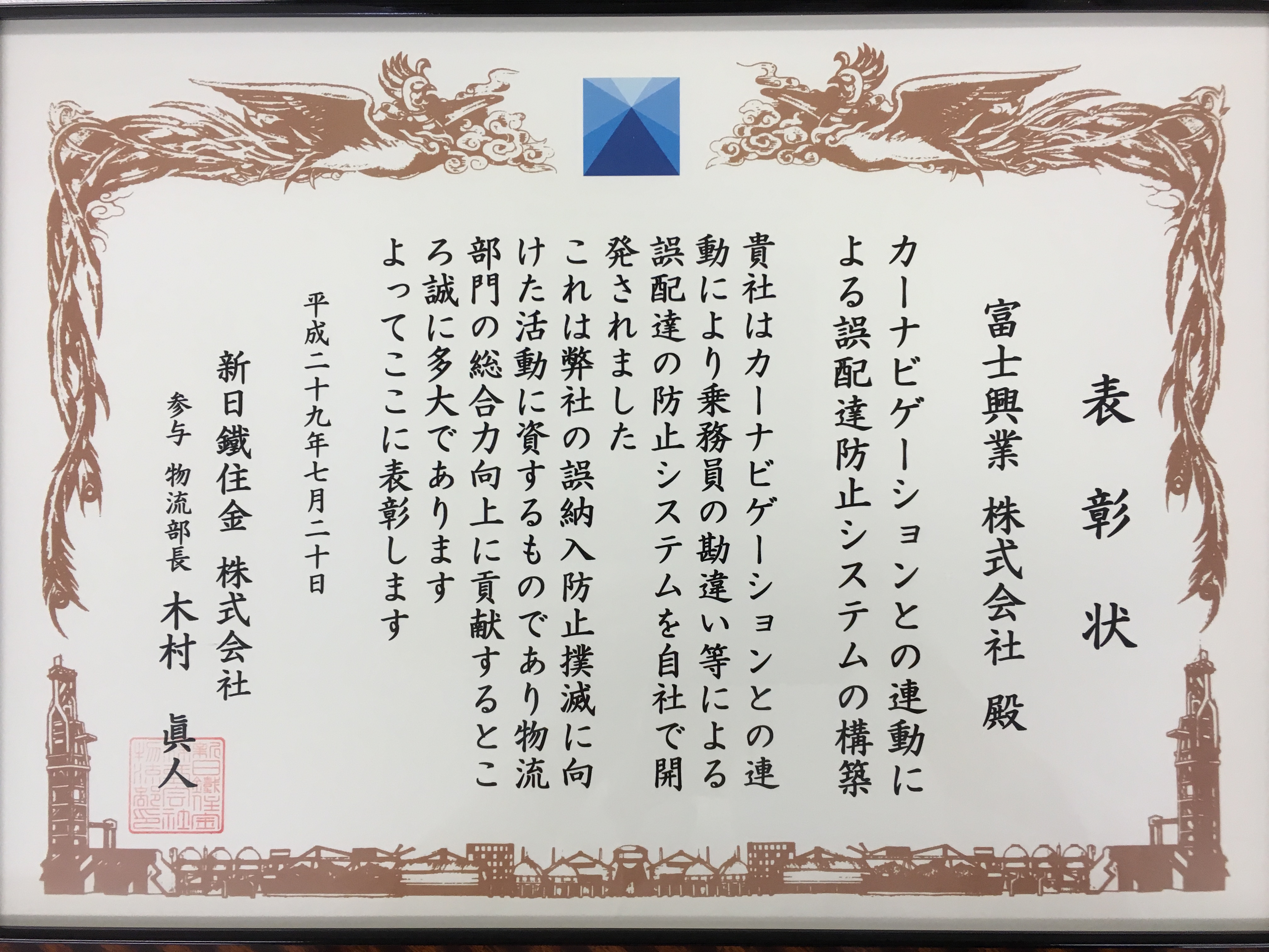 新日鐵住金株式会社様より物流部長表彰を頂きました