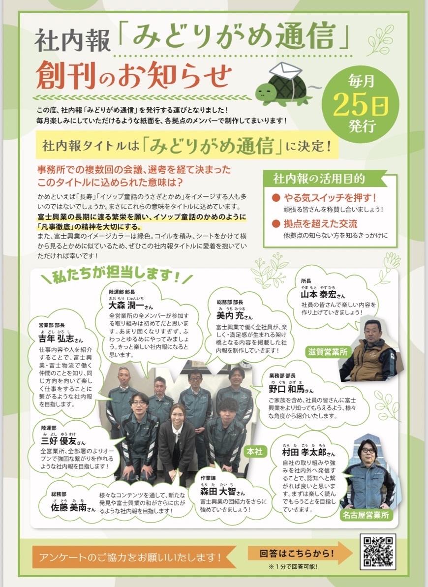 社内報はじめました! 4月25日創刊で社内報をはじめました! その名も「みどりがめ通信」!!! 記事にもあるように、拠点、部署間での交流。また、社員のご家族に富士興業で こんな仕事をしているよ!と、楽しく、そしてわかりやすく伝えられるような 社内報を作っていきます(^^)/ ※このHP内でも↑上↑のサイトナビゲーションからcheck出来ます!