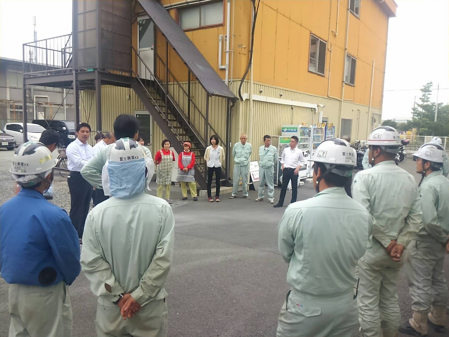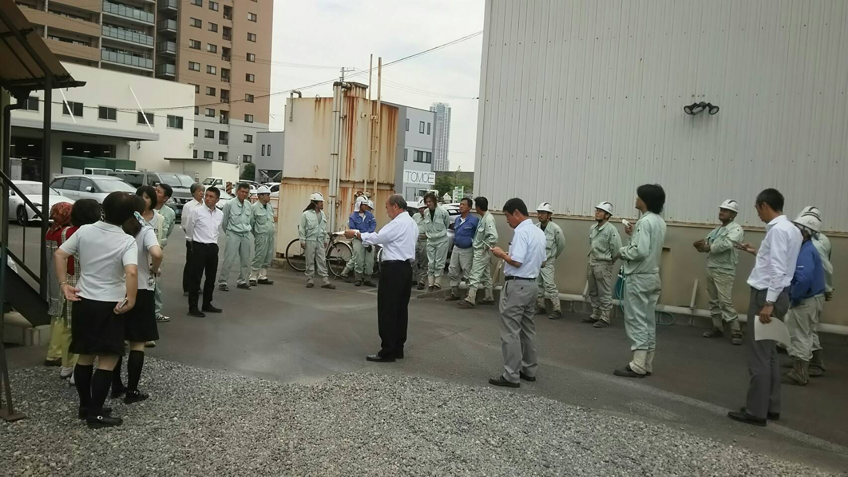 避難訓練をおこないました 平成29年9月5日11:00から行われた第5回大阪880万人訓練にあわせて当社でも避難訓練を行いました 避難場所に集合し総務部長による点呼をうけている様子 社長から避難訓練の趣旨や実際に災害が起こった時の行動について説明をうけました