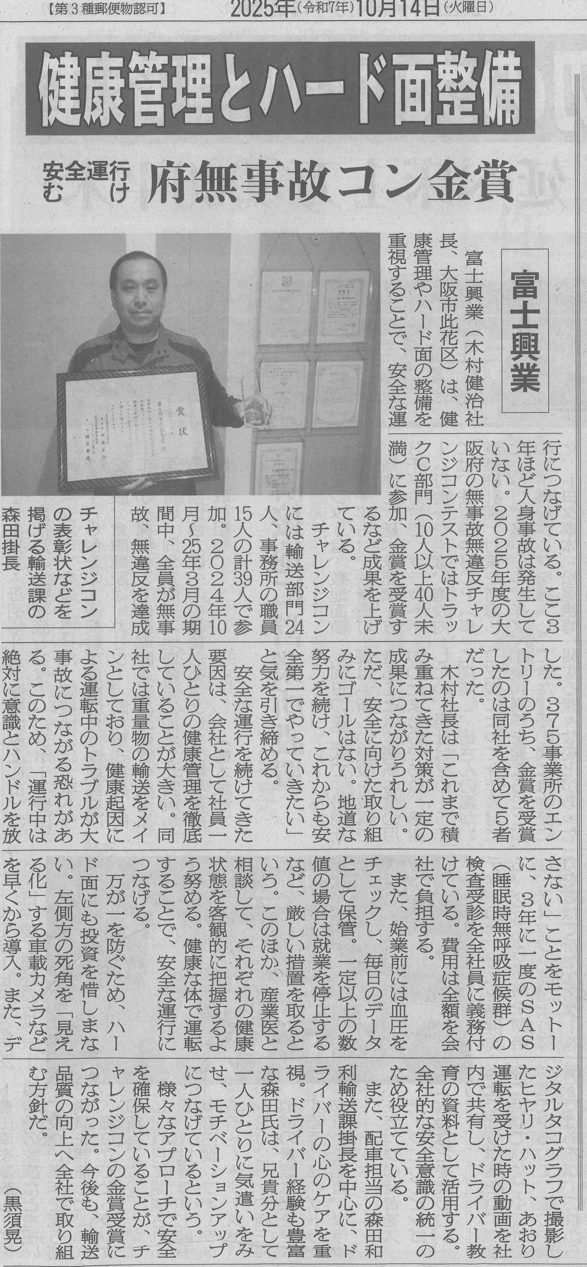 物流ニッポンに掲載されました この度、富士興業が2025年度大阪府の無事故違反チャレンジコンテストで金賞を受賞しました。 記事にもありますが、また受賞出来るように今後も様々な取り組みに挑戦し、輸送品質の向上へ 全社で取り組んでまいります('◇')ゞビシ!!!!